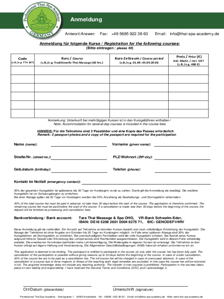 Ant wort/Answer:Fax: +49 5685 922 38 63Email: info@thaispaacademy.deAnmeldung for phosgene Nurse / Registration for the following courses: