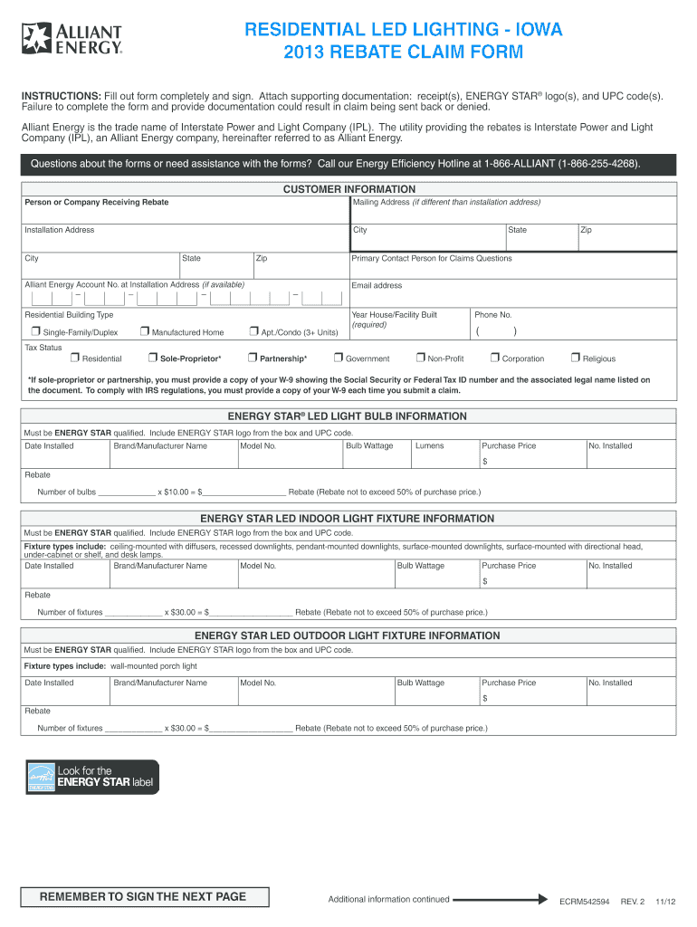 The form can be used by Alliant Energy customers in Iowa who have purchased and installed ENERGY STAR qualified LED light bulbs and fixtures. Ensure your purchases qualify for the rebate before applying.