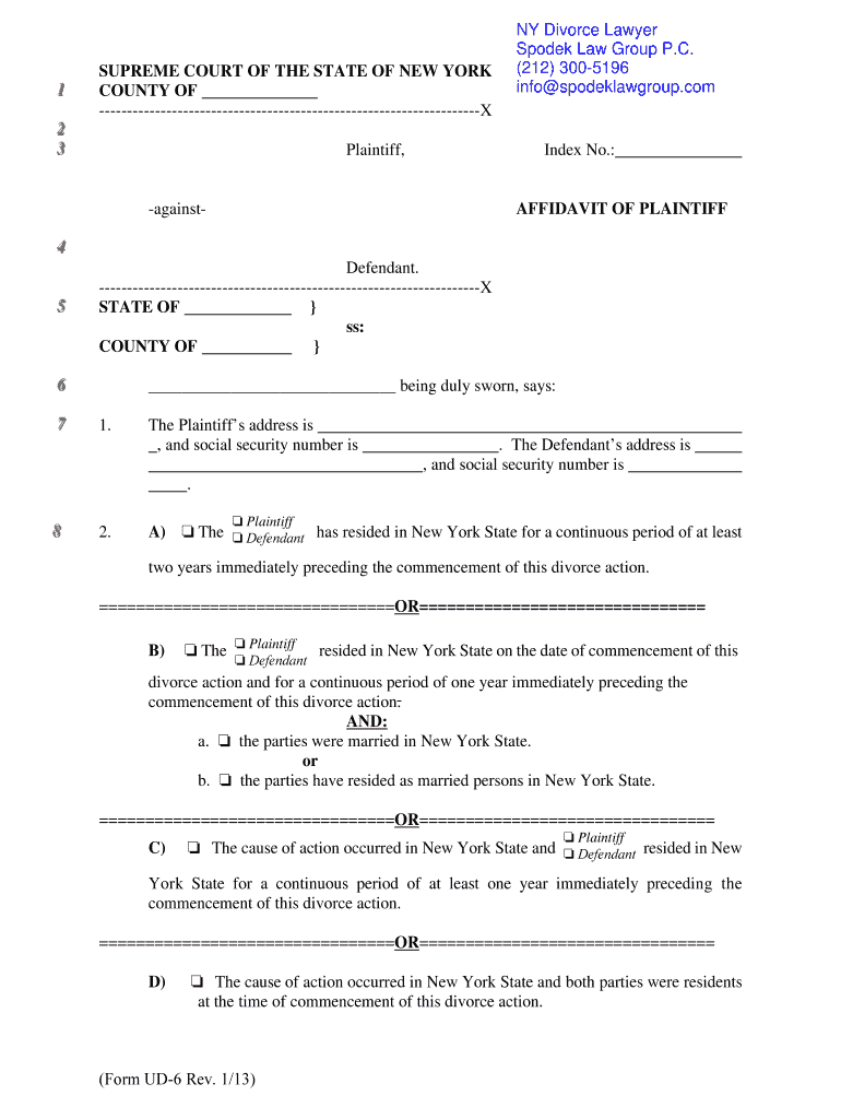 1 SUPREME COURT OF THE STATE OF NEW YORK COUNTY OF X 2 3 Plaintiff, NY Divorce Lawyer Spoken Law Group P.C. (212) 3005196 info spodeklawgroup.com Index No.: against AFFIDAVIT OF PLAINTIFF 4 5 Defendant.
