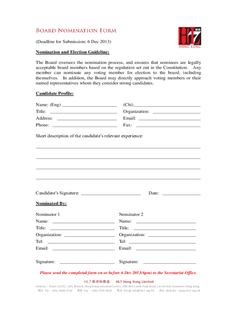 (Deadline for Submission: 6 Dec 2013) Nomination and Election Guideline: The Board oversees the nomination process, and ensures that nominees are legally acceptable board members based on the regulation