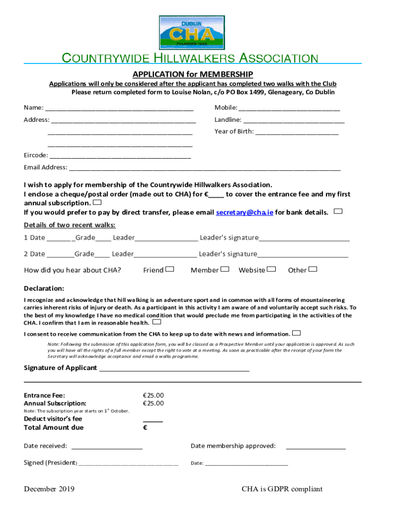 APPLICATION for MEMBERSHIPApplications will only be considered after the applicant has completed two walks with the Club Please return completed form to Louise Nolan, c/o PO Box 1499, Glengarry, Co