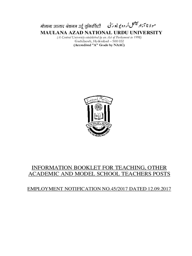 MAULANA AZAD NATIONAL URDU UNIVERSITY (A Central University established by an Act of Parliament in 1998) Gachibowli, Hyderabad 500 032 (Accredited “A Grade by NAACP)INFORMATION BOOKLET FOR TEACHING,