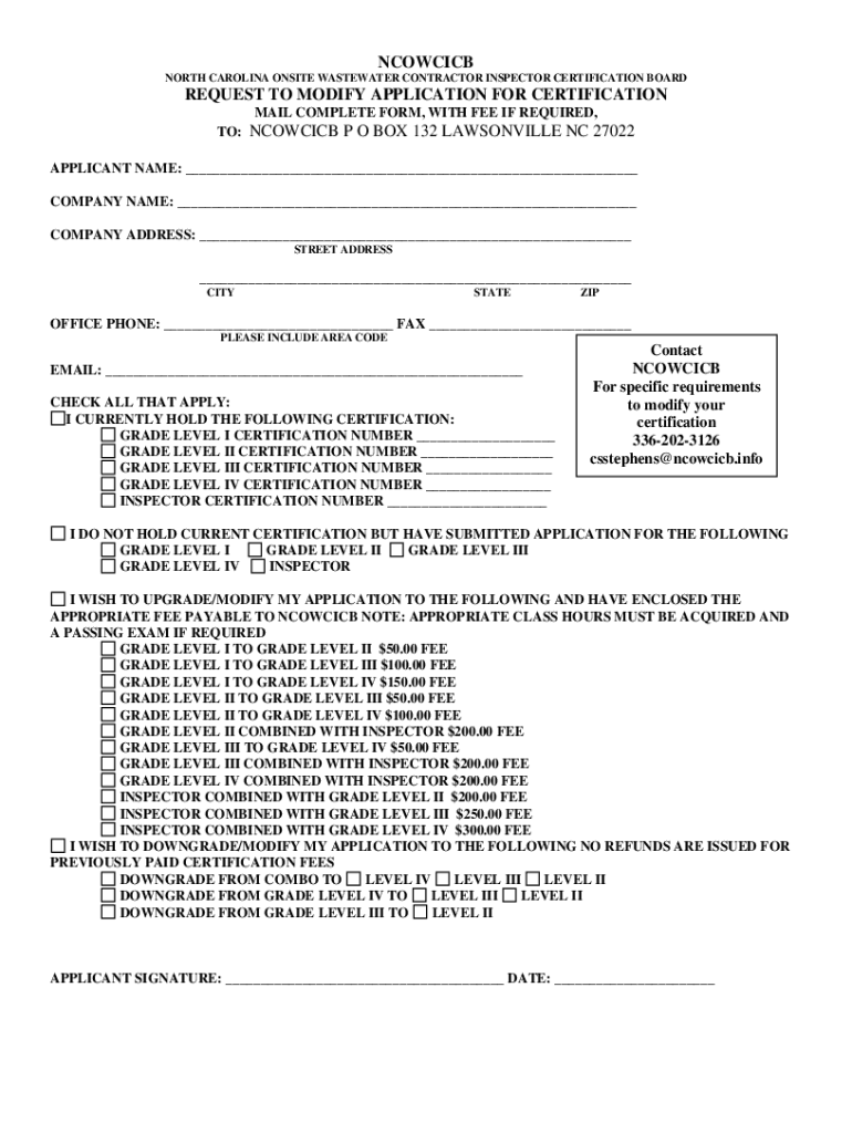COWLICK NORTH CAROLINA ONSITE WASTEWATER CONTRACTOR INSPECTOR CERTIFICATION BOARDREQUEST TO MODIFY APPLICATION FOR CERTIFICATION MAIL COMPLETE FORM, WITH FEE IF REQUIRED, TO:COWLICK P O BOX 132 WATSONVILLE