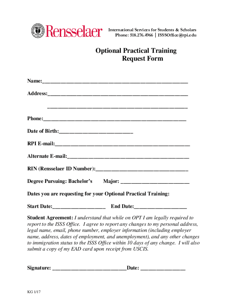 International Services for Students & Scholars Phone: 518.276.4966ISSSOffice RPI.educational Practical Training Request For F1 Undergraduate Students Optional practical training is defined as employment