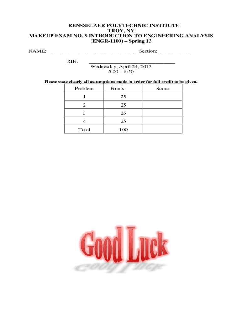 RENSSELAER POLYTECHNIC INSTITUTE TROY, NY MAKEUP EXAM NO. 3 INTRODUCTION TO ENGINEERING ANALYSIS (ENGR1100) Spring 13 NAME: Section: IN: Wednesday, April 24, 2013 5:00 6:50Please state clearly all