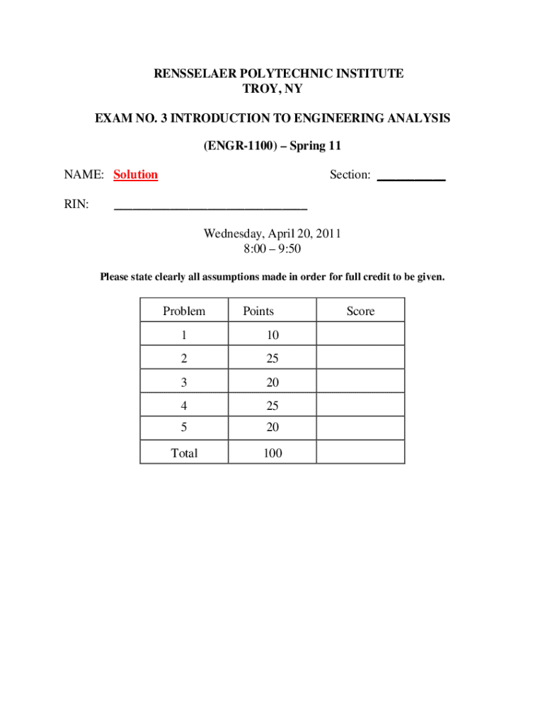 RENSSELAER POLYTECHNIC INSTITUTE TROY, NY EXAM NO. 3 INTRODUCTION TO ENGINEERING ANALYSIS (ENGR1100) Spring 11 NAME: Solution IN:Section: Wednesday, April 20, 2011 8:00 9:50 Please state clearly all