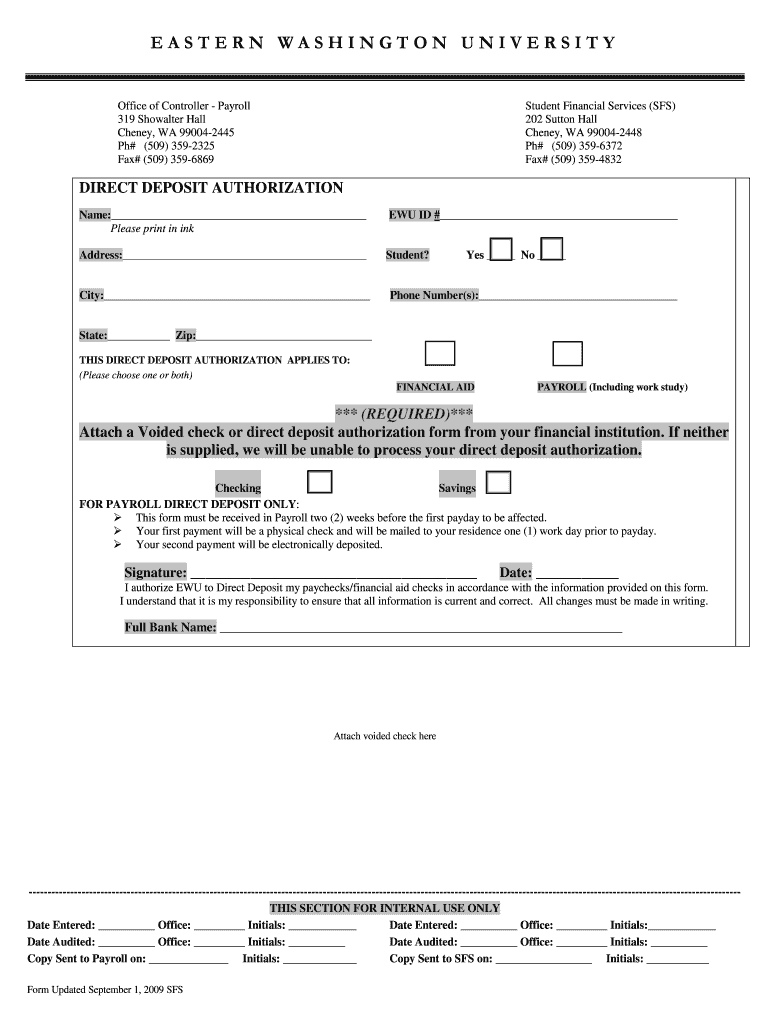 The Direct Deposit Authorization Form is a critical document for students at Eastern Washington University (EWU) to facilitate the electronic transfer of funds, such as financial aid or payroll directly to their bank accounts. It is designed specifically for those individuals who want to ensure timely and secure payments. This form not only streamlines the process but also helps reduce the risk of lost checks.
