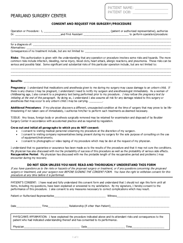 PATIENT NAME: PATIENT DOB: PEARLAND SURGERY CENTERCONSENT AND REQUEST FOR SURGERY/PROCEDURE Operation or Procedure: I, (patient or authorized representative), authorize Dr. and First Assistant to