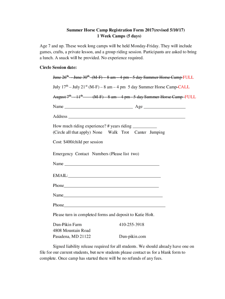 Get the free Summer Horse Camp Registration Form 2017(revised 5/10/17)