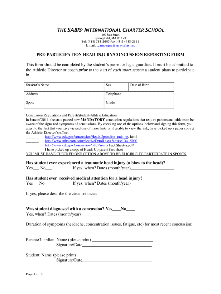 Tel: (413) 7832600 Fax: (413) 7832555Email: tcampagna@sicssabis.netPREPARTICIPATION HEAD INJURY/CONCUSSION REPORTING From