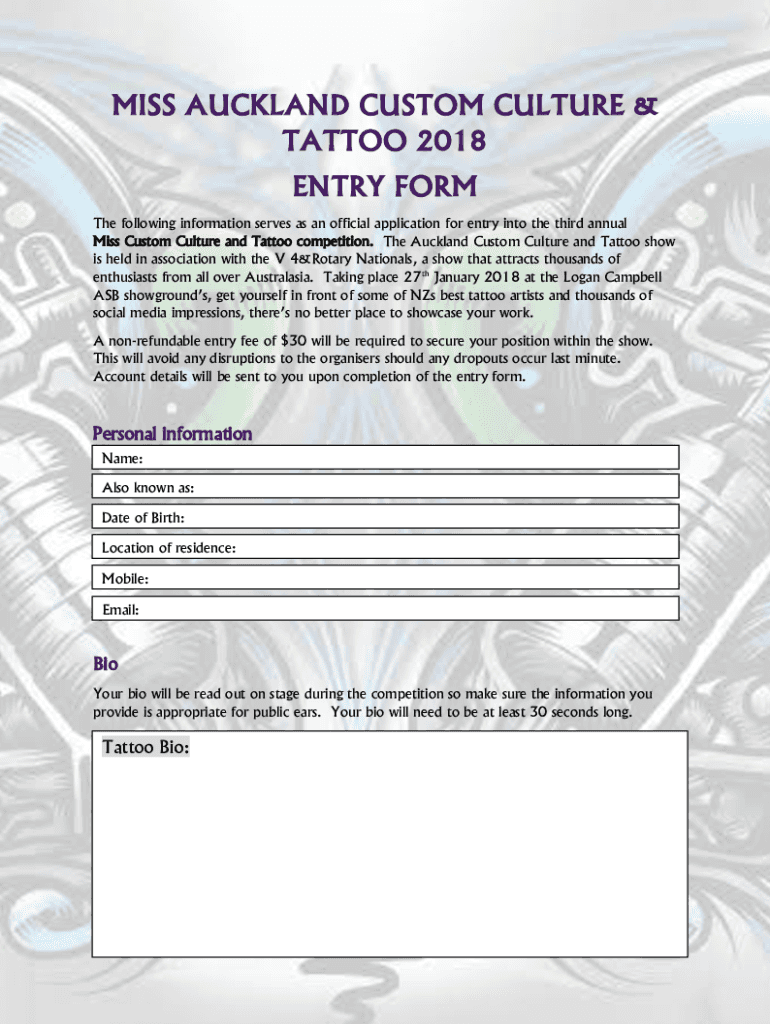 MISS AUCKLAND CUSTOM CULTURE & TATTOO 2018 ENTRY FORM The following information serves as an official application for entry into the third annual Miss Custom Culture and Tattoo competition. The Auckland