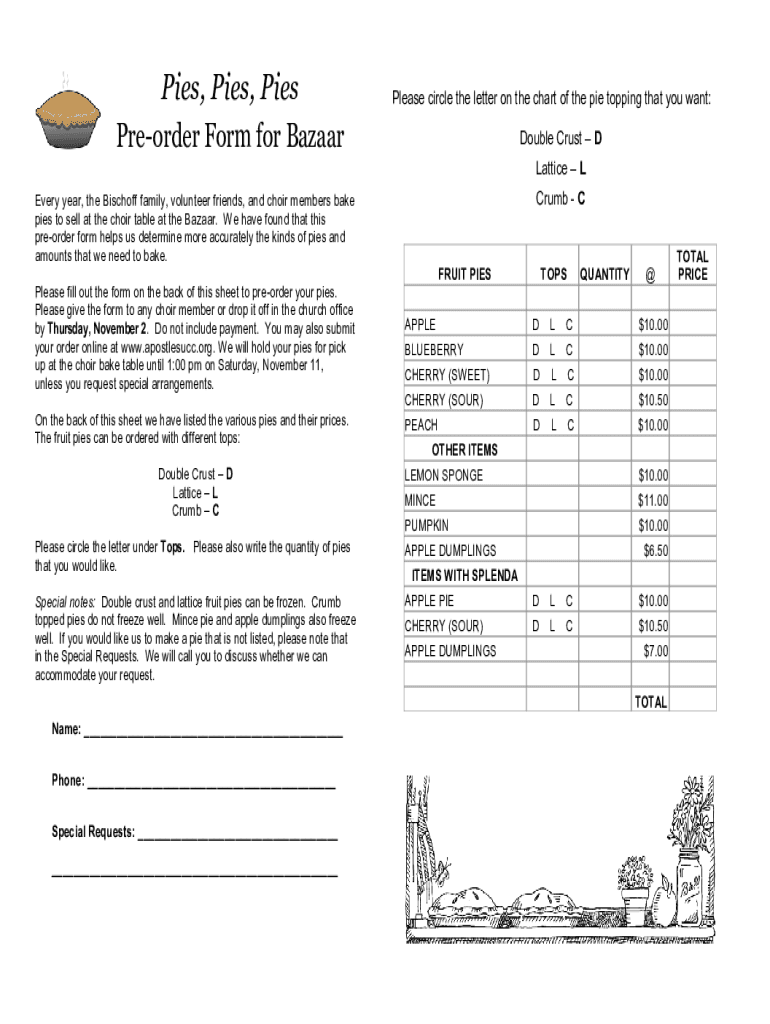 Pies, Pies, Displease circle the letter on the chart of the pie topping that you want:Preorder Form for BazaarDouble Crust D Lattice L Crumb Every year, the Bishop family, volunteer friends, and choir