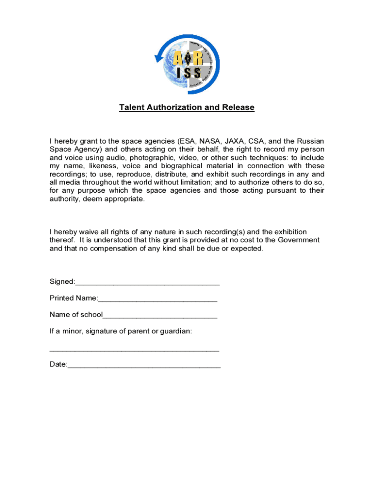 Talent Authorization and Released hereby grant to the space agencies (ESA, NASA, JAVA, CSA, and the Russian