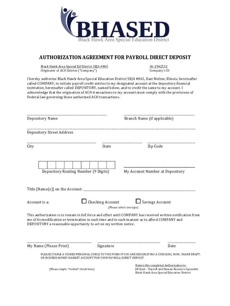 AUTHORIZATION AGREEMENT FOR PAYROLL DIRECT DEPOSITBlack Hawk Area Special Ed District SEA #865Originator of ACH Entries (Company)362942532Companys ID hereby authorize Black Hawk Area Special Education District SEA #865, East Molina, Illinois, hereinafter