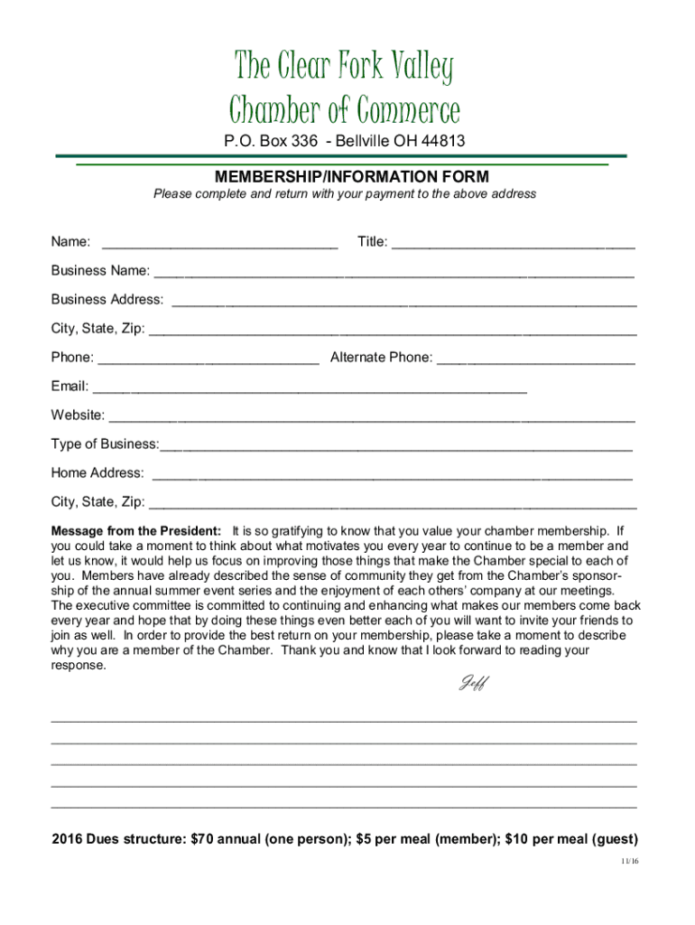 The Clear Fork Valley Chamber of Commerce P.O. Box 336 Bellville OH 44813 MEMBERSHIP/INFORMATION FORM Please complete and return with your payment to the above addressable: Title: Business Name: Business