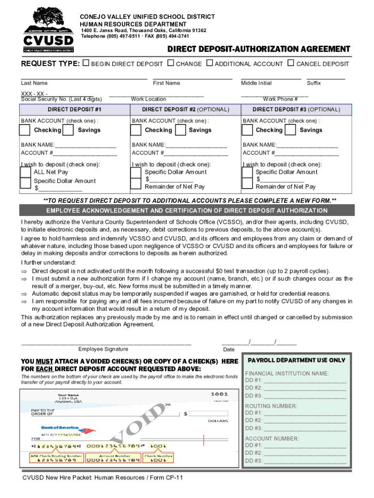 CONE JO VALLEY UNIFIED SCHOOL DISTRICT HUMAN RESOURCES DEPARTMENT 1400 E. Janis Road, Thousand Oaks, California 91362 Telephone (805) 4979511 FAX (805) 4943741DIRECT DEPOSITAUTHORIZATION AGREEMENT