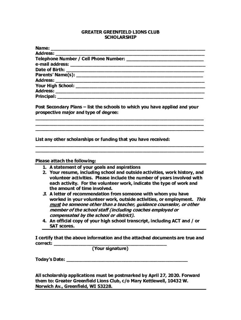 Get the free GREATER GREENFIELD LIONS CLUB SCHOLARSHIP Name: Address ...