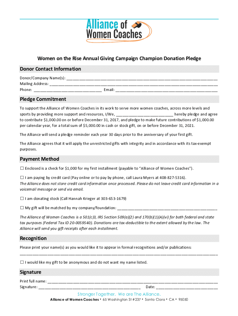 Women on the Rise Annual Giving Campaign Champion Donation PledgeDonor Contact InformationDonor/Company Name(s): Mailing Address: Phone: Email: Pledge Commitment support the Alliance of Women Coaches