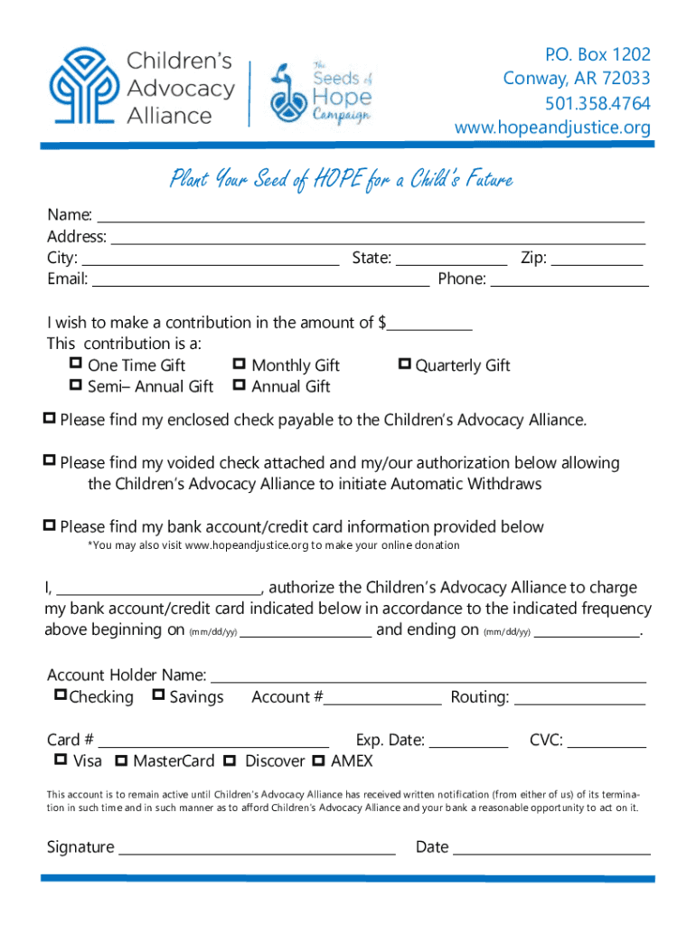 P.O. Box 1202 Conway, AR 72033 501.358.4764 www.hopeandjustice.orgPlant Your Seed of HOPE for a Child's Future Name: Address: City: State: Zip: Email: Phone: I wish to make a contribution in the amount