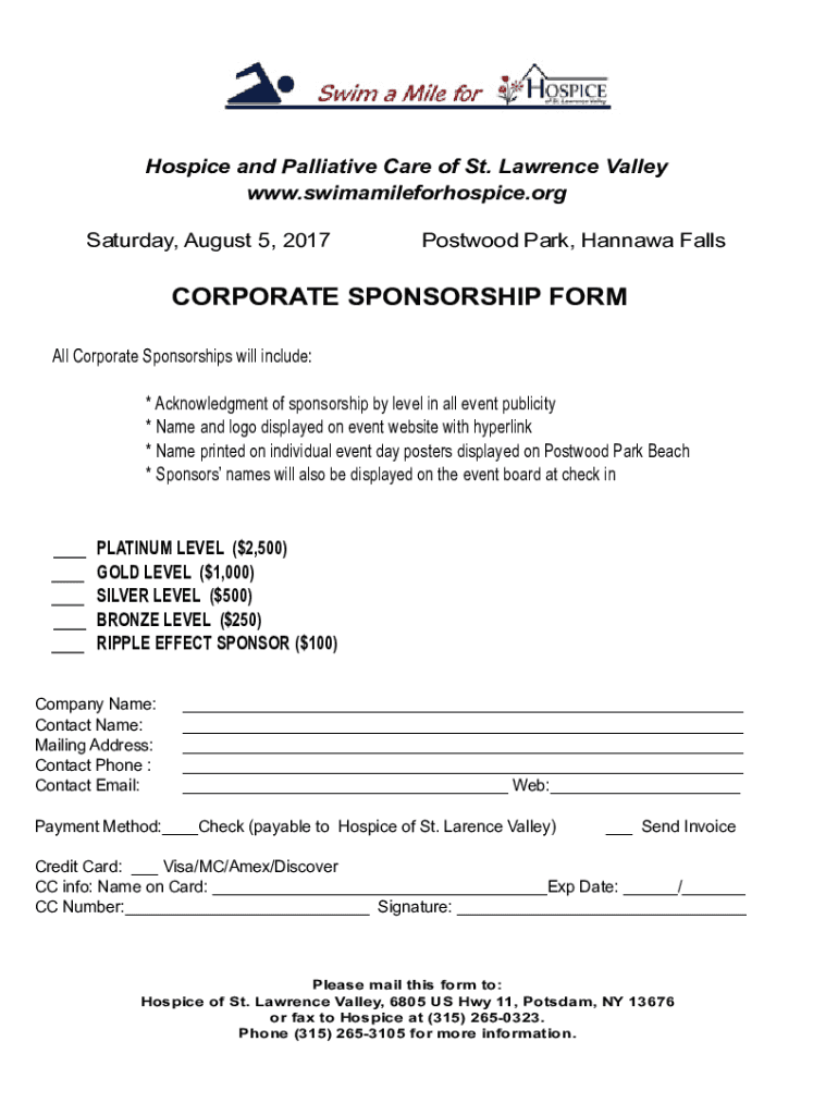 Hospice and Palliative Care of St. Lawrence Valley www.swimamileforhospice.org Saturday, August 5, 2017Postwood Park, Hanna FallsCORPORATE SPONSORSHIP Formal Corporate Sponsorships will include:*