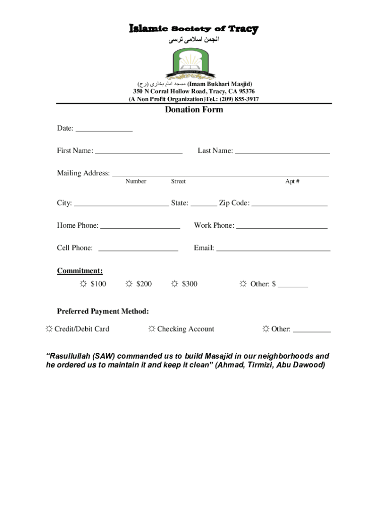 )((Imam Bukhara Masjid) 350 N Corral Hollow Road, Tracy, CA 95376 (A Non Profit Organization)Tel.: (209) 8553917Donation Form Date: First Name: Last Name: Mailing Address: NumberStreetApt #City: State: