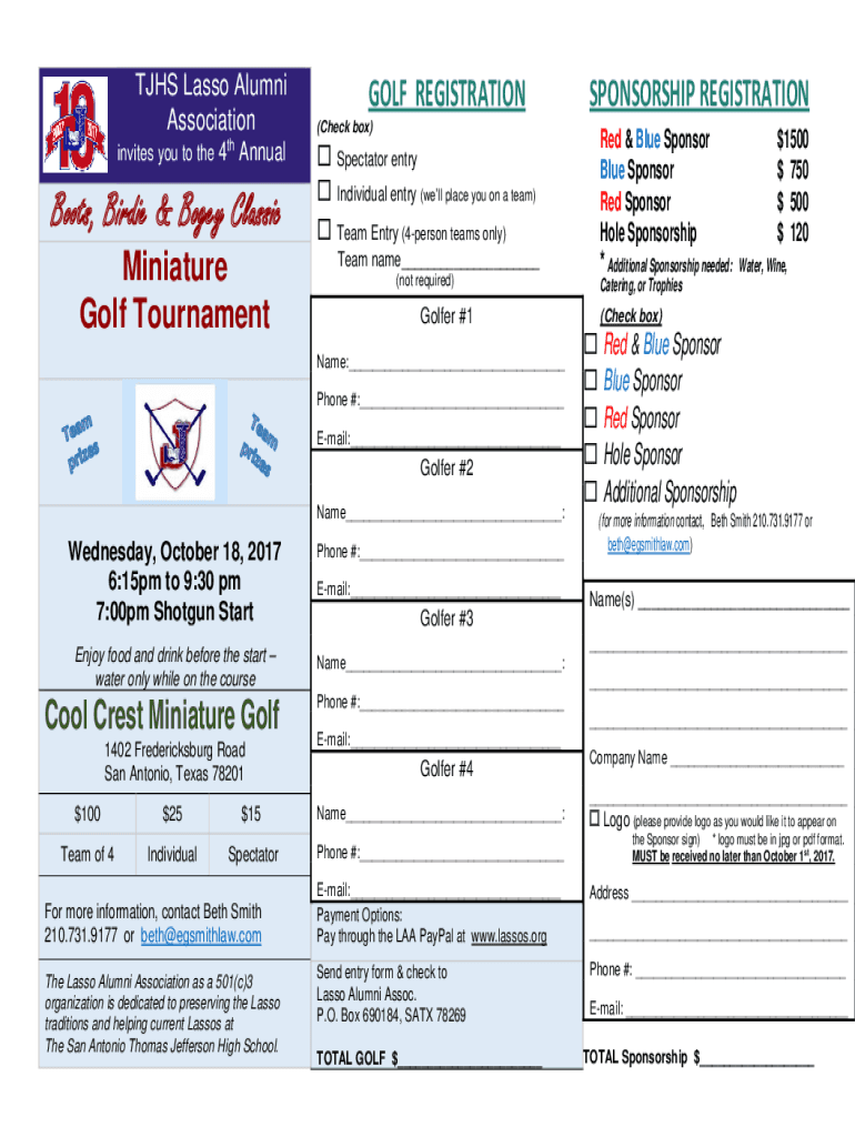 JHS Lasso Alumni Association invites you to the 4th AnnualBoots, Birdie & Bogey Classic Miniature Golf TournamentGOLF REGISTRATION (Check box) Spectator entry Individual entry (well place you on a
