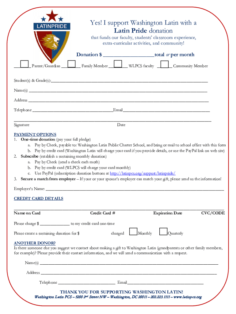 Yes! I support Washington Latin with a Latin Pride donation that funds our faculty, students classroom experience, extracurricular activities, and community! Donation $ total or per month Parent/Guardian