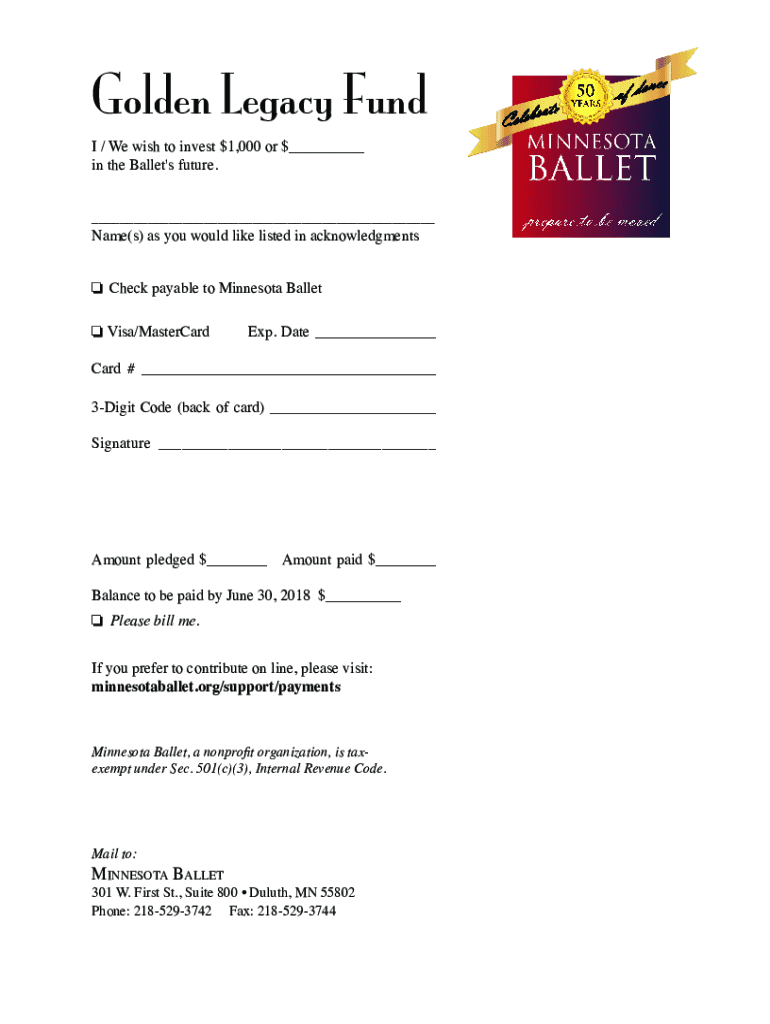 Golden Legacy Fund50yearsI / We wish to invest $1,000 or $ in the Ballet's future. Name(s) as you would like listed in acknowledgmentsCheck payable to Minnesota Ballet Visa/MasterCard. Date Card #