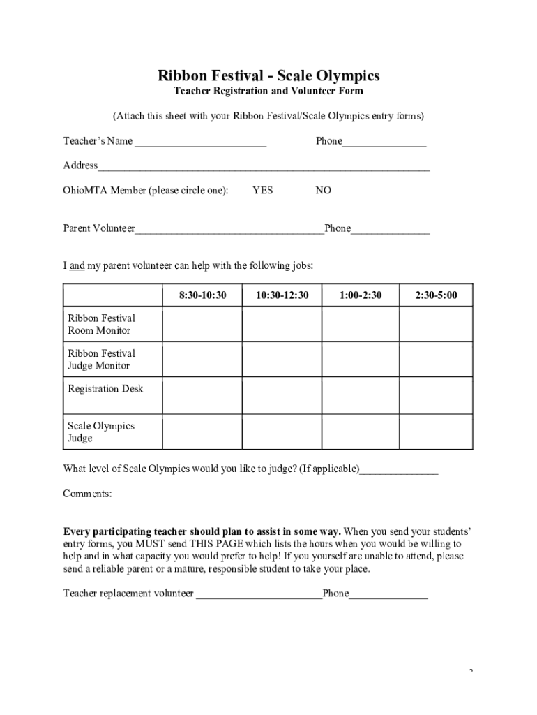 Ribbon Festival Scale Olympics Teacher Registration and Volunteer Form (Attach this sheet with your Ribbon Festival/Scale Olympics entry forms) Teachers Name Phone Address Ohio MTA Member (please