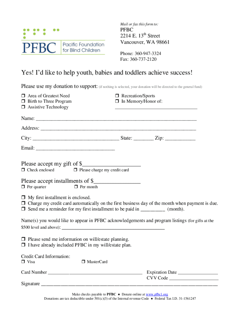 Mail or fax this form to:PFC 2214 E. 13th Street Vancouver, WA 98661 Phone: 3609473324 Fax: 3607372120Yes! I'd like to help youth, babies and toddlers achieve success! Please use my donation to support: