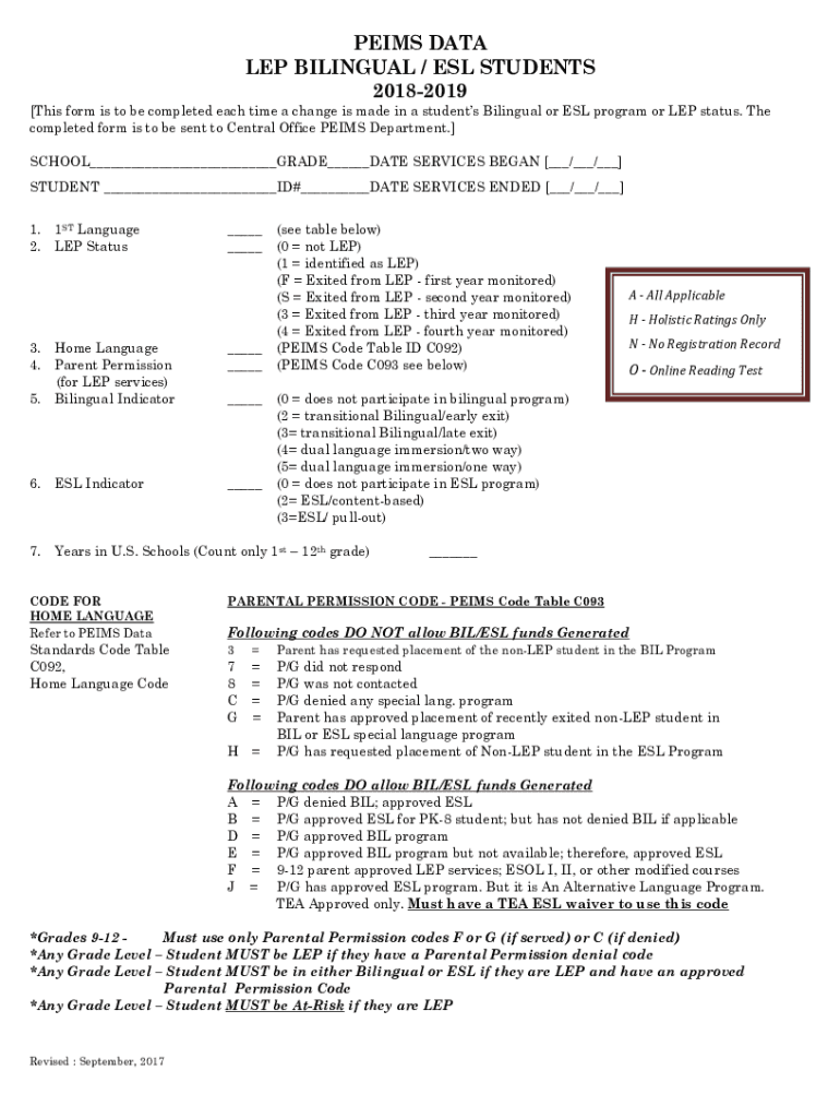 PERMS DATA LEP BILINGUAL / ESL STUDENTS 20182019 This form is to be completed each time a change is made in a students Bilingual or ESL program or LEP status. The completed form is to be sent to Central
