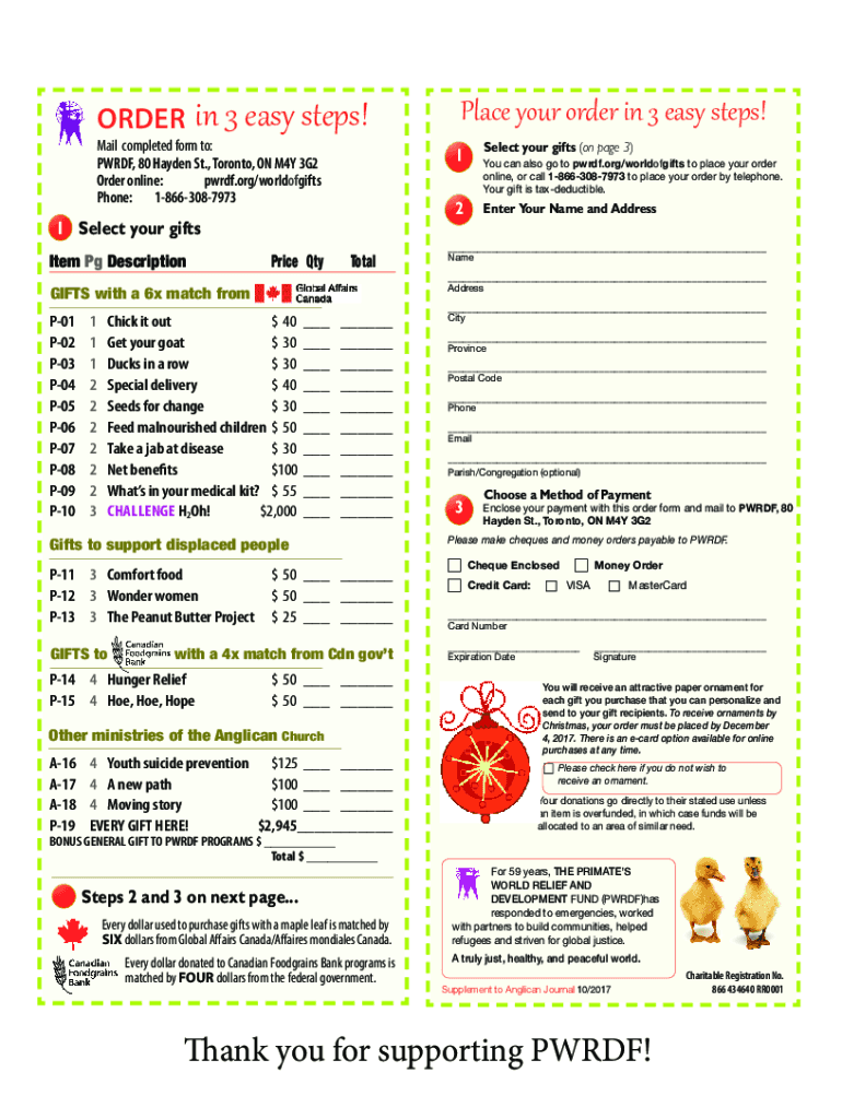 Ordering 3 easy steps! Mail completed form to: PW RDF, 80 Hayden St., Toronto, ON M4Y 3G2 Order online:pwrdf.org/worldofgifts Phone:18663087973PriceQtyTotalGIFTS with a 6x match from P01P02P03P04P05P06P07P08P09P101112222223Chick