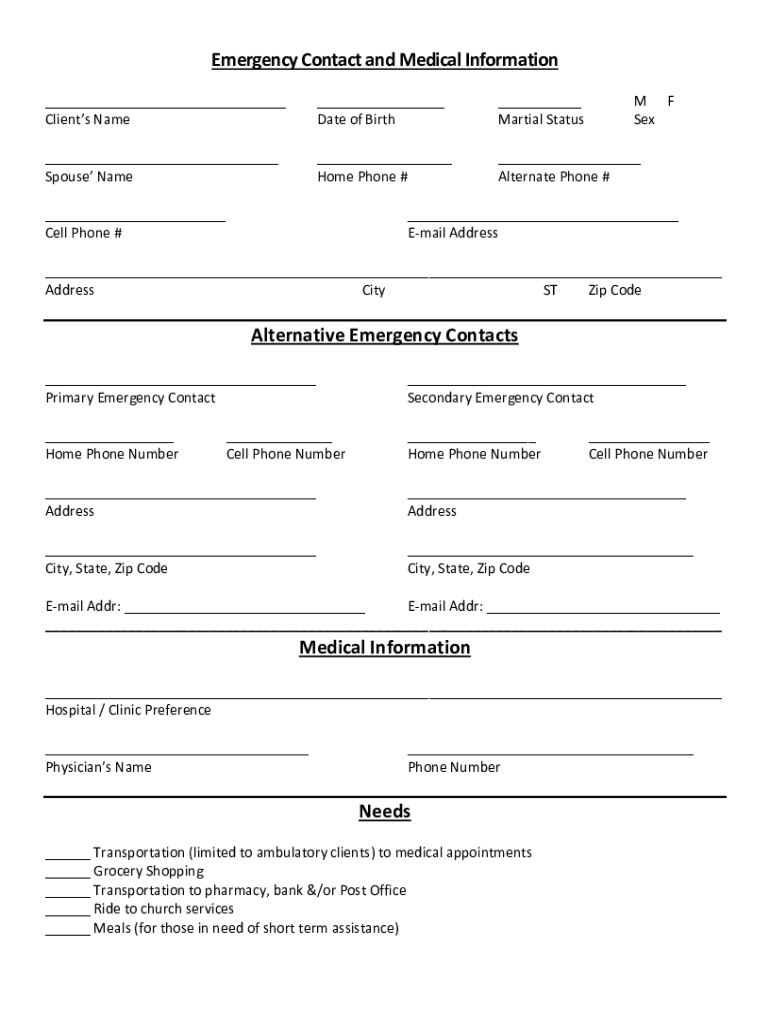 Emergency Contact and Medical Information Clients Name Date of Birth Martial Status Spouse Name Home Phone # Alternate Phone # Cell Phone #M F Sex Email Address City ST Zip CodeAlternative Emergency