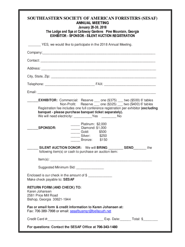 SOUTHEASTERN SOCIETY OF AMERICAN FORESTERS (SESA) ANNUAL MEETING January 2830, 2018 The Lodge and Spa at Callaway Gardens Pine Mountain, Georgia EXHIBITOR SPONSOR SILENT AUCTION REGISTRATION YES,