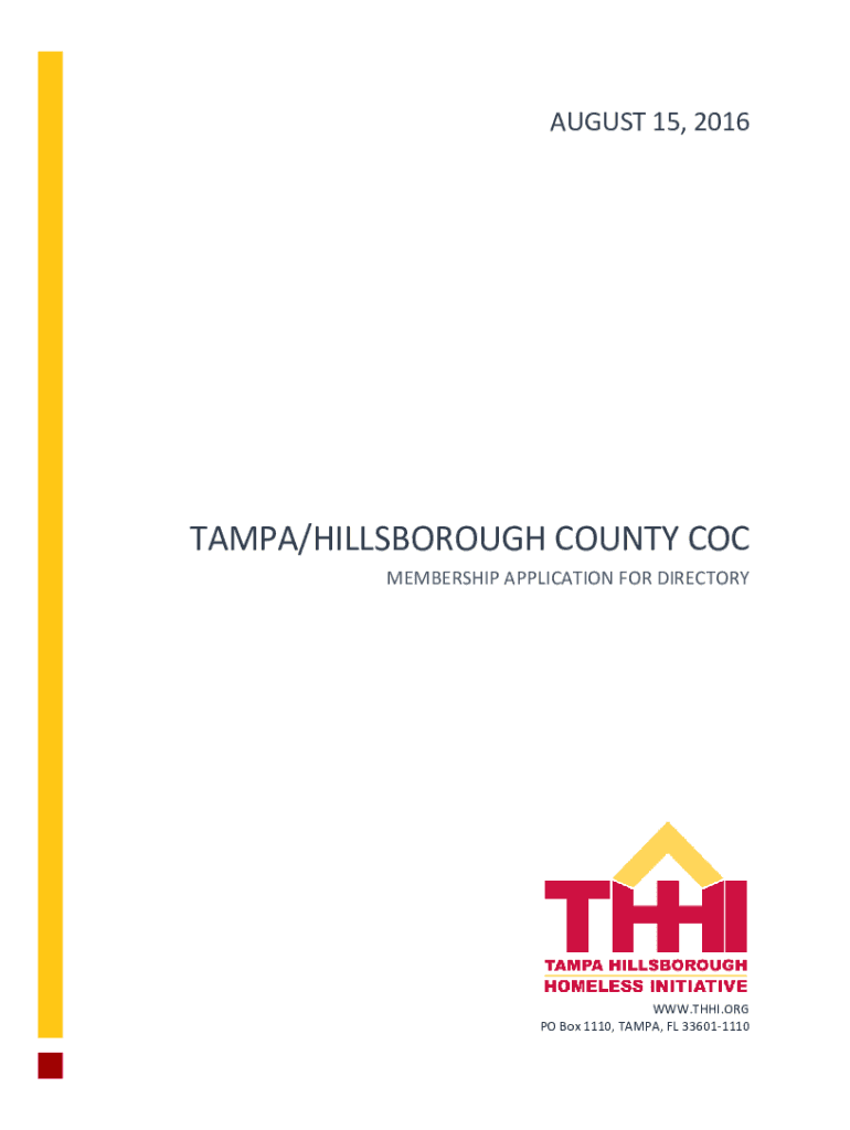 AUGUST 15, 2016TAMPA/HILLSBOROUGH COUNTY COC MEMBERSHIP APPLICATION FOR DIRECTORY WWW.THAI.ORG PO Box 1110, TAMPA, FL 336011110Tampa Hillsborough County COC Membership Form UNITY Community Point Directory