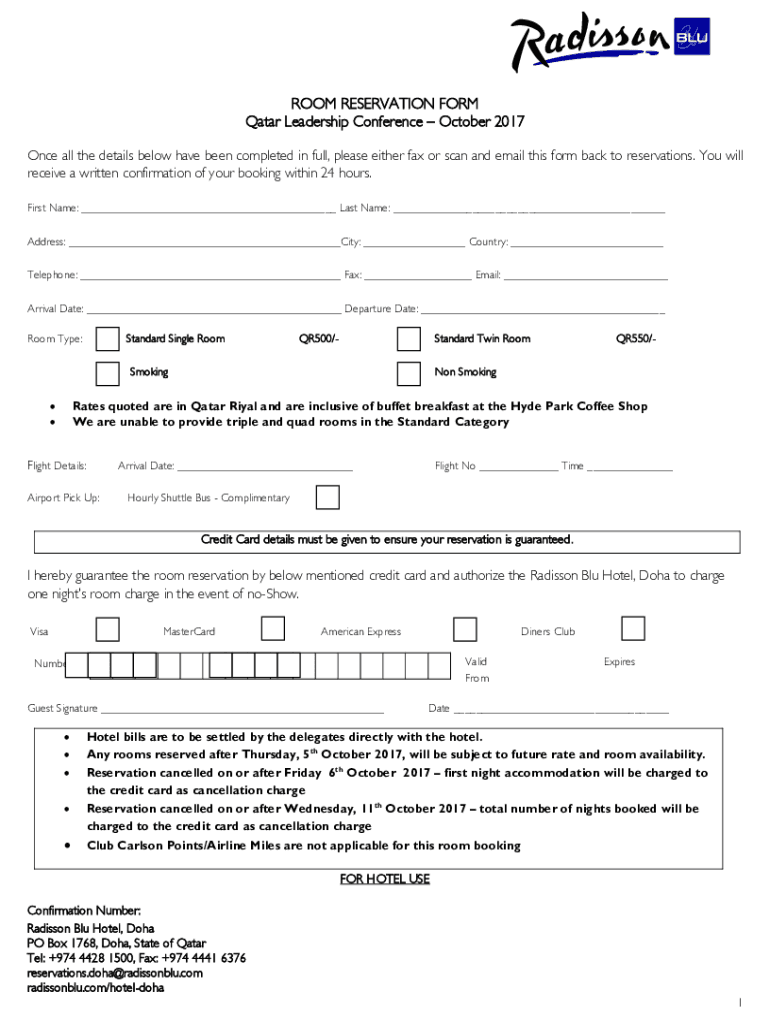 ROOM RESERVATION FORM Qatar Leadership Conference October 2017 Once all the details below have been completed in full, please either fax or scan and email this form back to reservations. You will