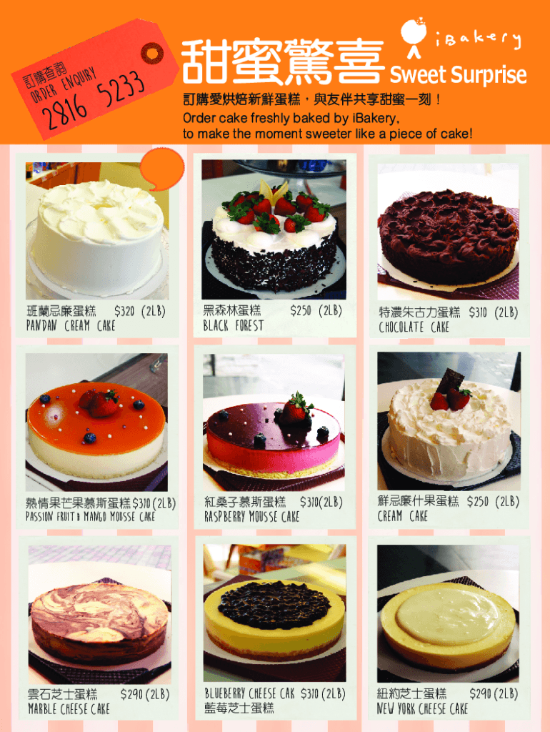 Iraq n e Order6 1 8 2Sweet Surprise$3325320 (2lb) Panda cream cake$310 (2lb) Passion Fruit & mango mousse cake$290 (2lb) Marble cheese cake$250 (2lb)Black forest$310(2lb) Raspberry mousse cake$310