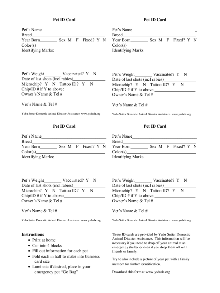 Pet ID Carpet ID Carpets Name Breed Year Born Sex M F Fixed? Y N Color(s) Identifying Marks:Pets Name Breed Year Born Sex M F Fixed? Y N Color(s) Identifying Marks:Pets Weight Vaccinated? Y N Date