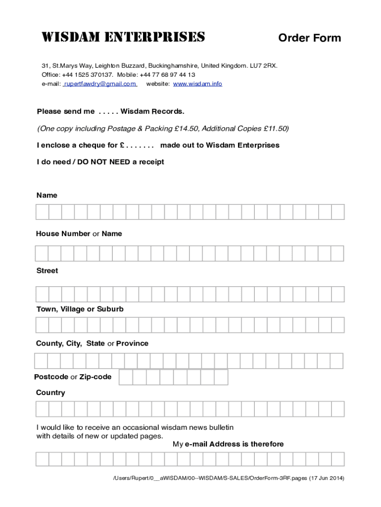 WISDOM ENTERPRISESOrder Form31, St. Mary's Way, Leighton Buzzard, Buckingham shire, United Kingdom. LU7 2RX. Office: +44 1525 370137. Mobile: +44 77 68 97 44 13 email: rupertfawdry gmail.com website: