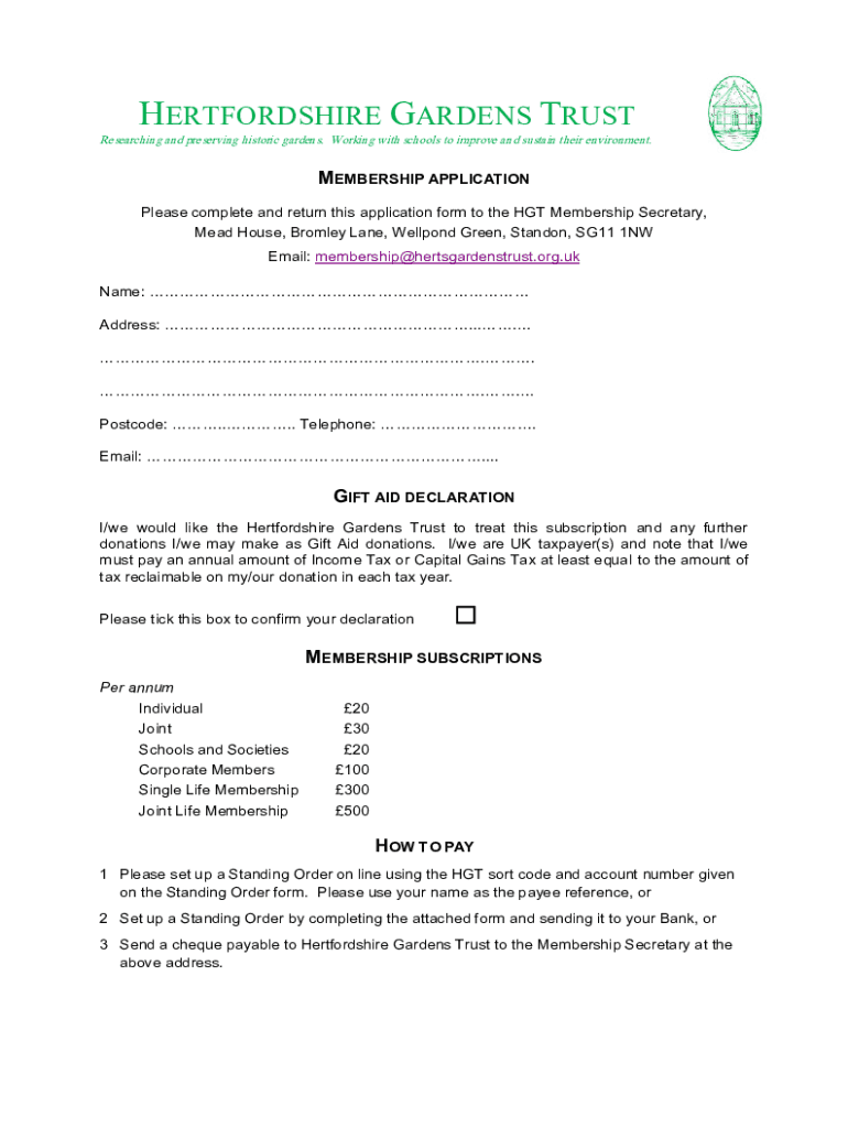 HERTFORDSHIRE GARDENS TRUSTResearching and preserving historic gardens. Working with schools to improve and sustain their environment. MEMBERSHIP APPLICATION Please complete and return this application