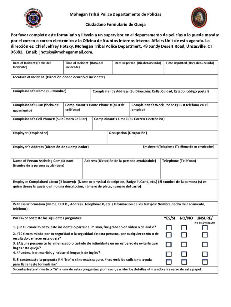 POR favor complete ester formulation y level a UN supervisor en El department DE polices o lo suede manner