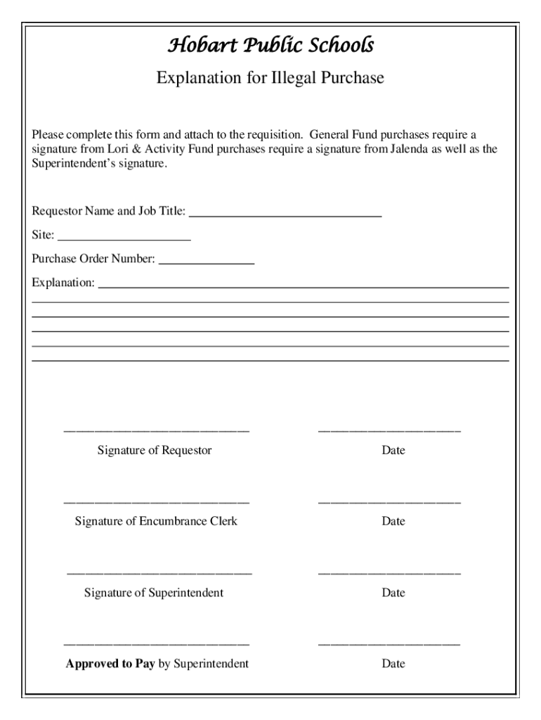 Hobart Public Schools Explanation for Illegal Purchase Please complete this form and attach to the requisition. General Fund purchases require a signature from Lori & Activity Fund purchases require