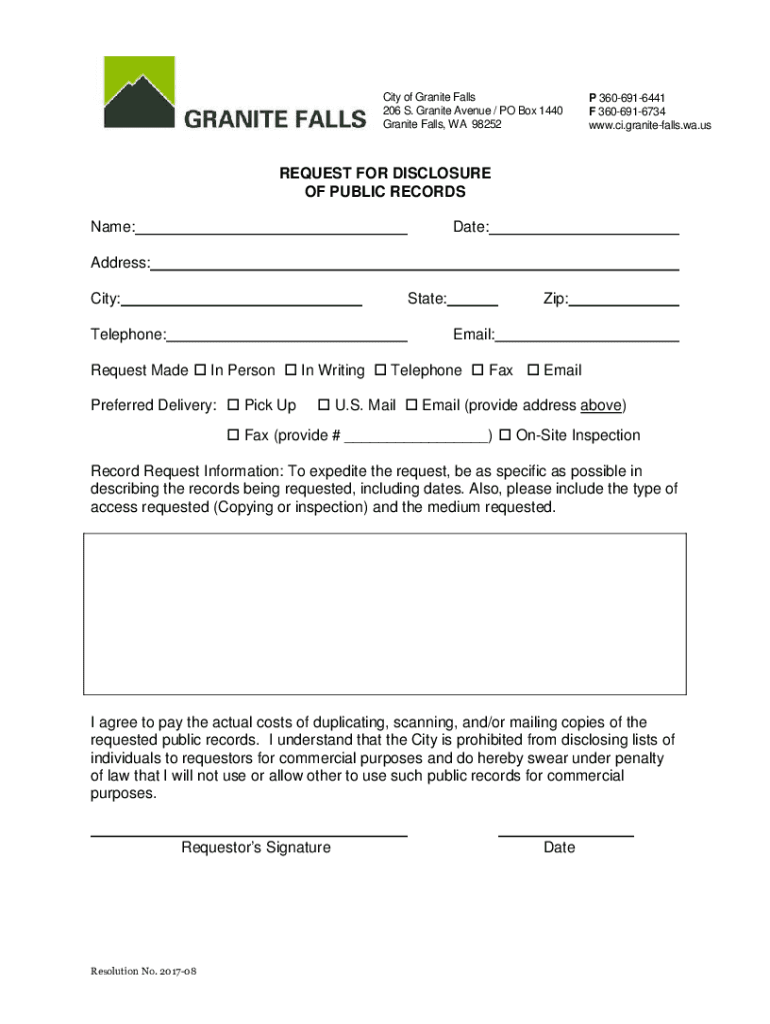 City of Granite Falls 206 S. Granite Avenue / PO Box 1440 Granite Falls, WA 98252P 3606916441 F 3606916734 www.ci.granitefalls.wa.usREQUEST FOR DISCLOSURE OF PUBLIC RECORDS Name:Date:Address: City:State:Telephone:Zip: