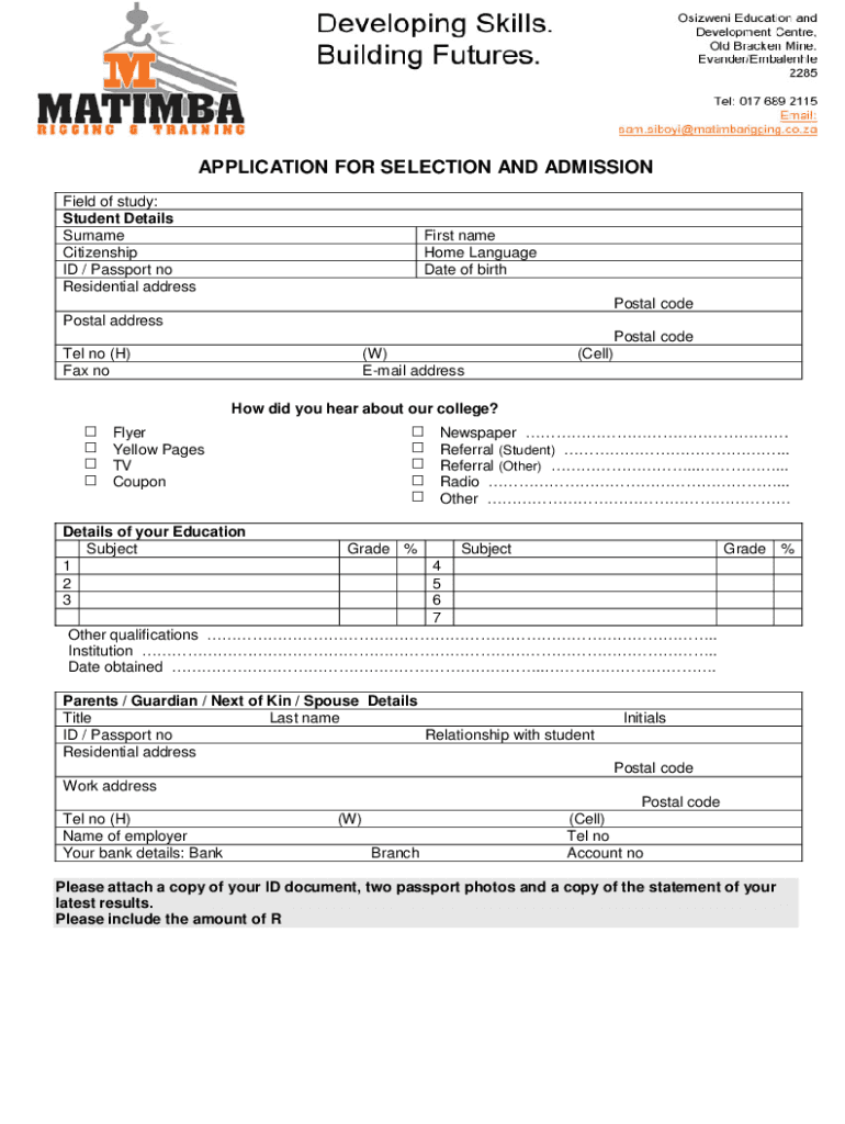 APPLICATION FOR SELECTION AND ADMISSION Field of study: Student Details Surname Citizenship ID / Passport no Residential addressFirst name Home Language Date of birth Postal code qqqqqqqqqqqPostal