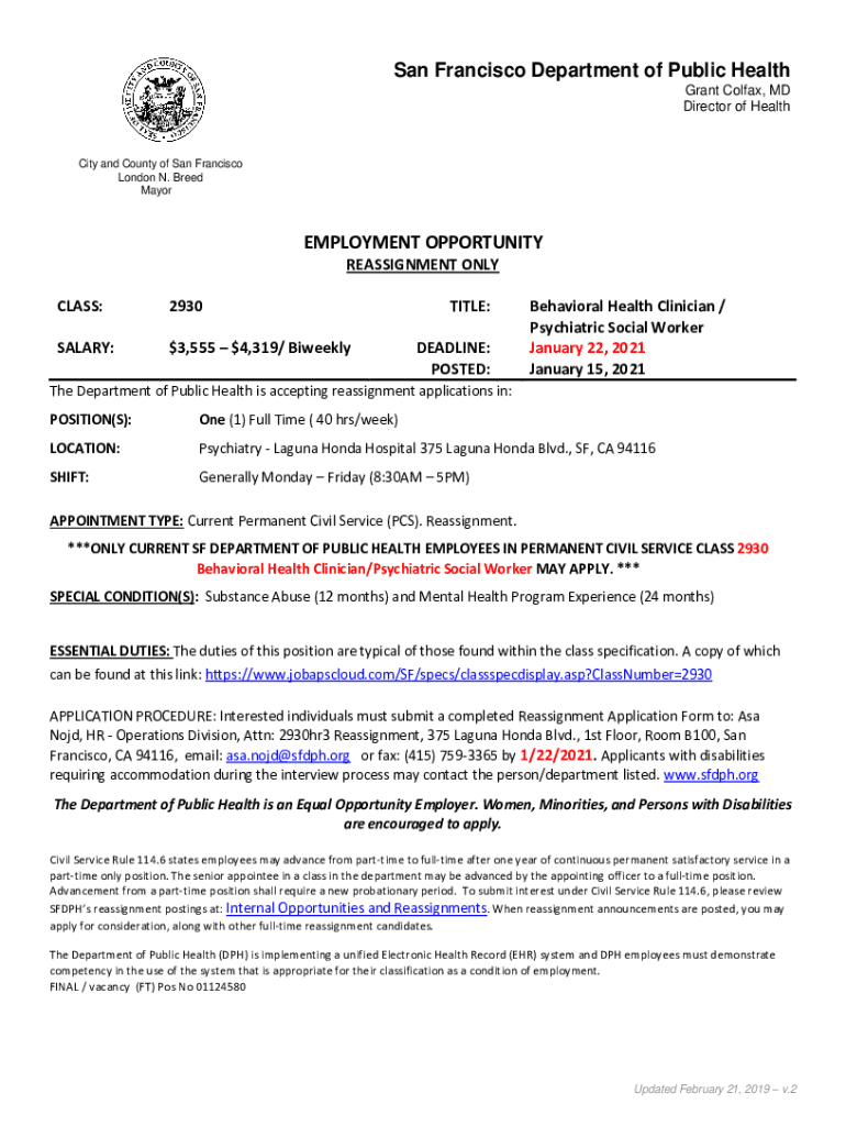 San Francisco Department of Public Health Grant Colfax, MD Director of Healthily and County of San Francisco London N. Breed MayorEMPLOYMENT OPPORTUNITY REASSIGNMENT ONLY CLASS:2930SALARY:$$3,5554,319/