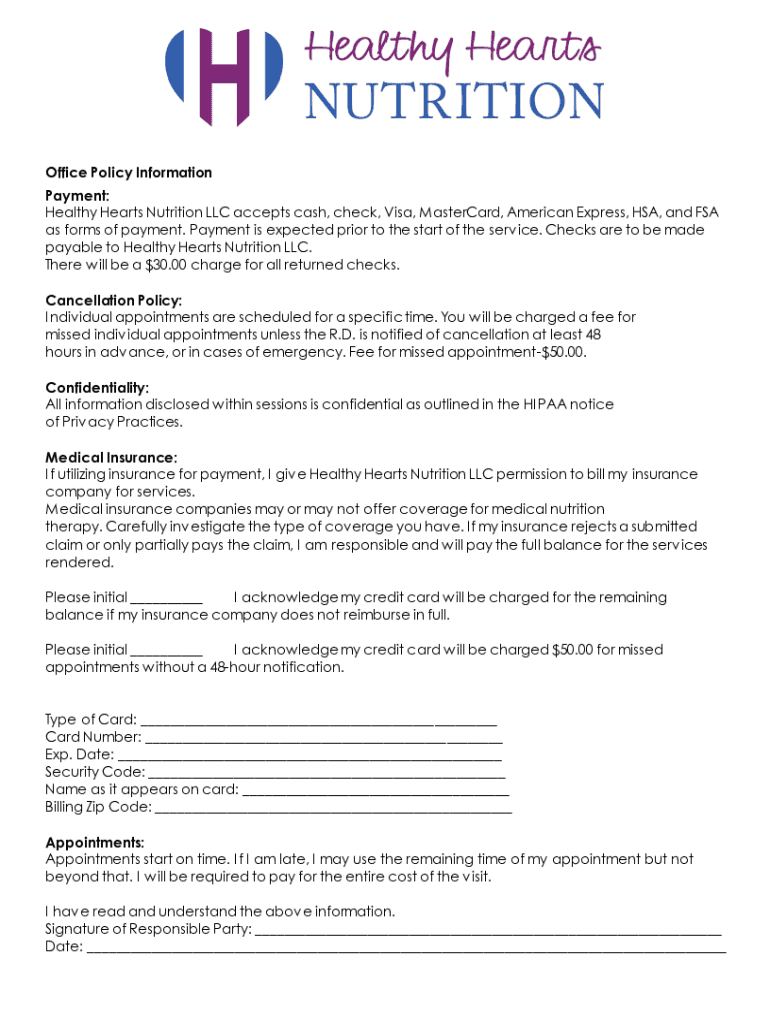 Healthy Hearts Nutrition LLC accepts cash, check, Visa, MasterCard, American Express, HSA, and FSA