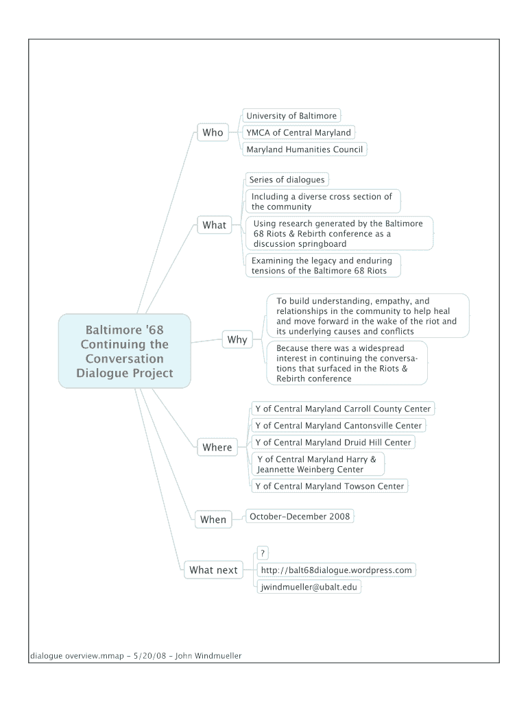 This document outlines a series of community dialogues focusing on the legacy and tensions arising from the Baltimore 68 Riots. It aims to build understanding and empathy among community members while