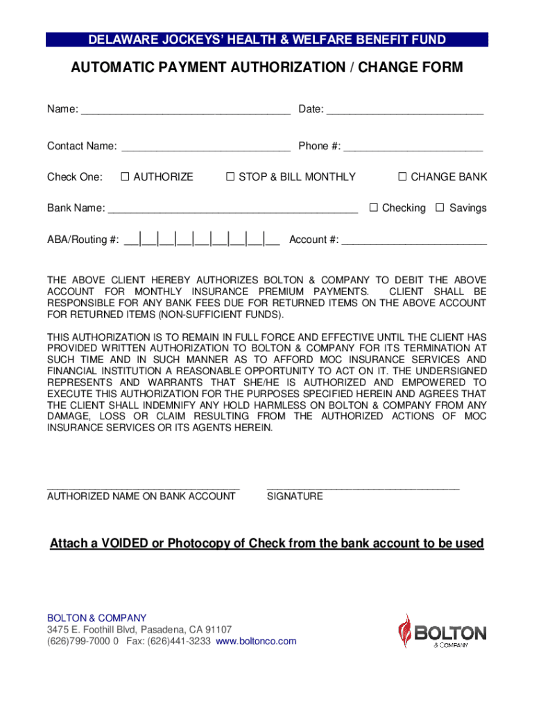 DELAWARE JOCKEYS HEALTH & WELFARE BENEFIT FUNDAUTOMATIC PAYMENT AUTHORIZATION / CHANGE FORM Name: Date: Contact Name: Phone #: STOP & BILL MONTHLY CHANGE Sandbank Name: Checking SavingsCheck One: