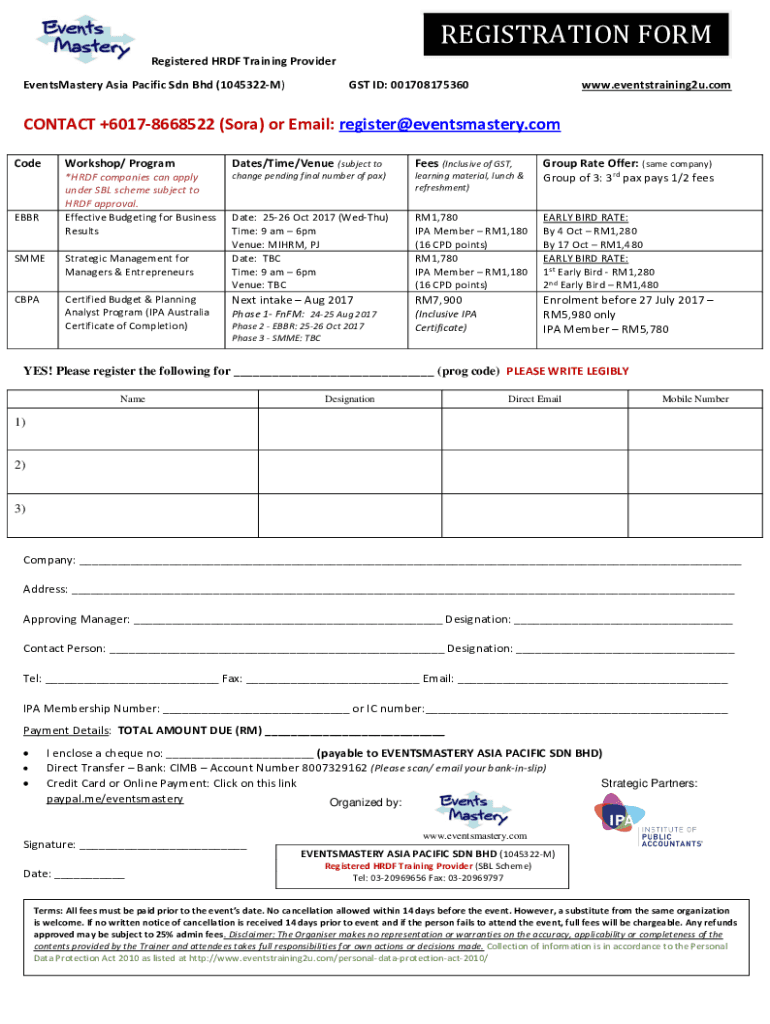 REGISTRATION FORM Registered HDF Training Provider EventsMastery Asia Pacific SDN BHD (1045322M)GST ID: 001708175360www.eventstraining2u.noncontact +60178668522 (Sort) or Email: register eventsmastery.com