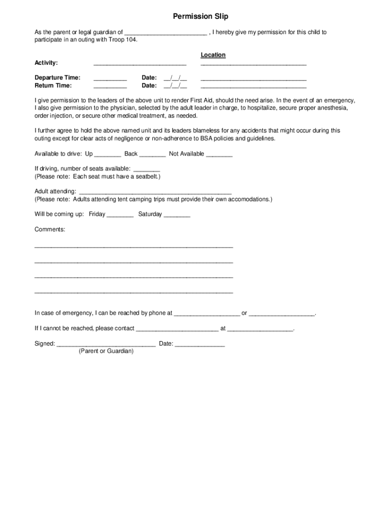 Permission Slip As the parent or legal guardian of, I hereby give my permission for this child to participate in an outing with Troop 104. Activity: Location Departure Time: Return Time: Date: Date:
